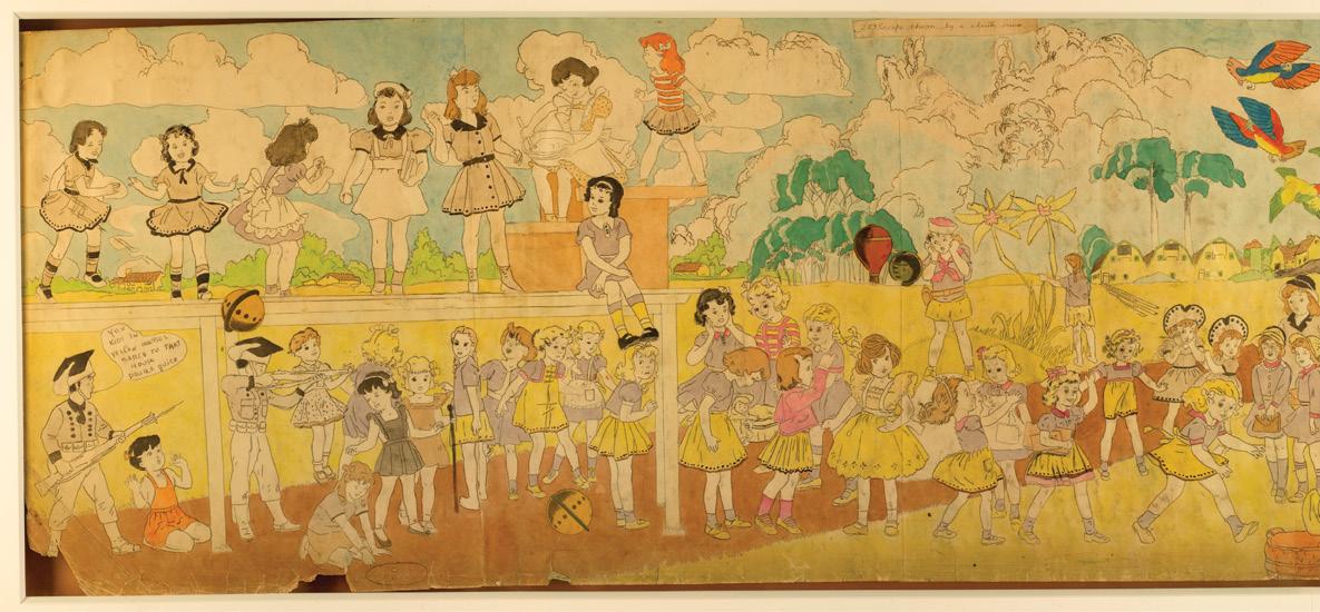 204 They are cleverly outwitted and captured by glandelinian boyscouts and placed in a large hall like room with windows nailed shut, c. 1950-60. Mixed media, dimensions unknown. Collection of Audrey B. Heckler. Photograph © 2021 Visko Hatfield. © 2022 Kiyoko Lerner / Artists Rights Society (ARS), New York
