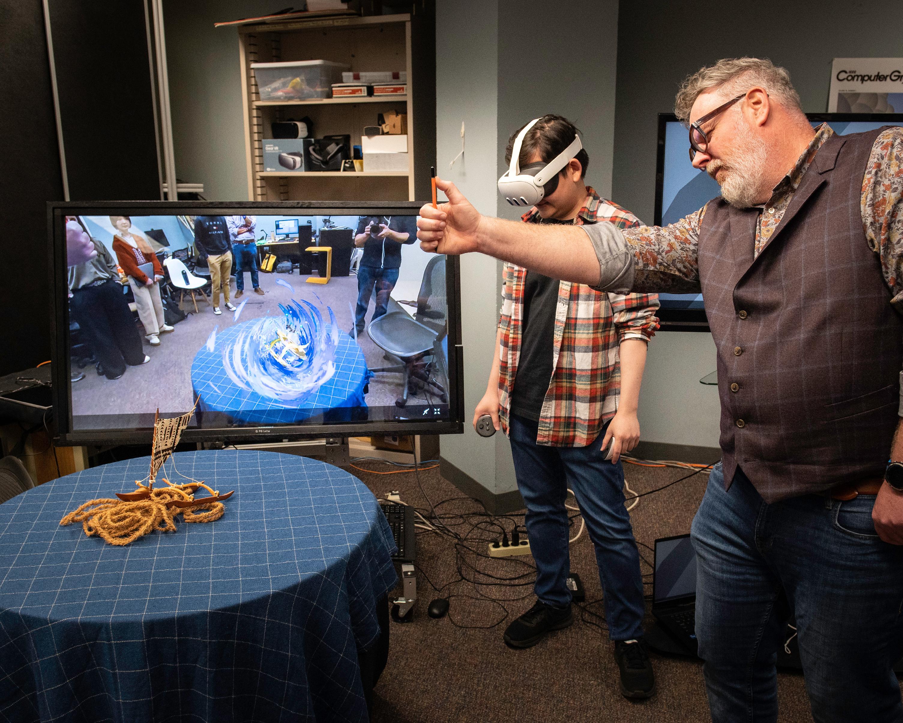 CS&E Ph.D. student Kiet Tran, who is also an artist, demonstrates how 3D drawing in virtual spaces becomes a tool for studying a subject when you can see through the headset to carefully observe the real world around you.