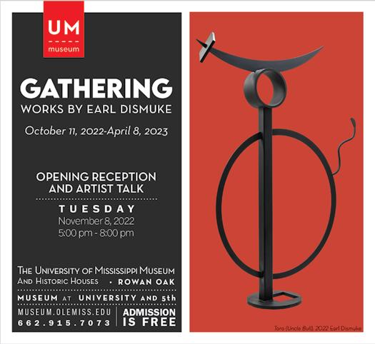An opening reception and artist talk feature Earl Dismuke and his “Gathering” exhibit, on display through April. 5-8 p.m., University of Mississippi Museum. museum.olemiss.edu