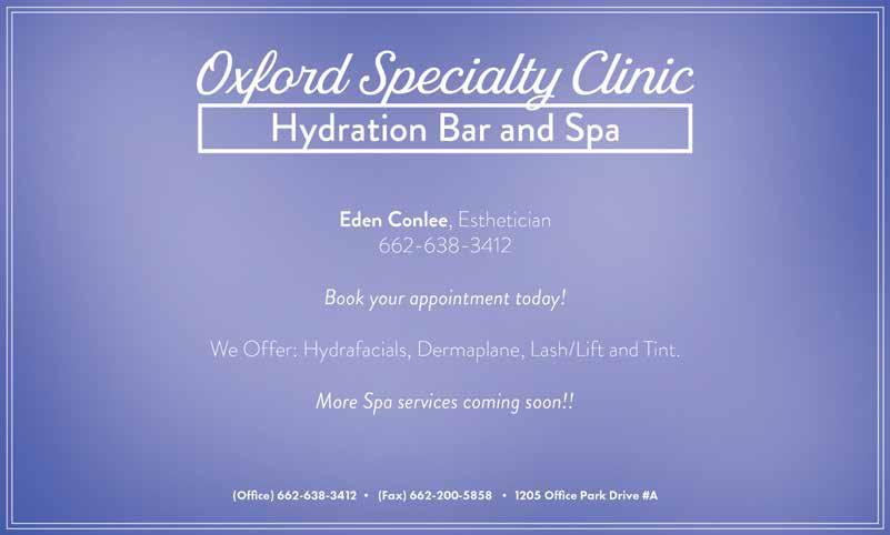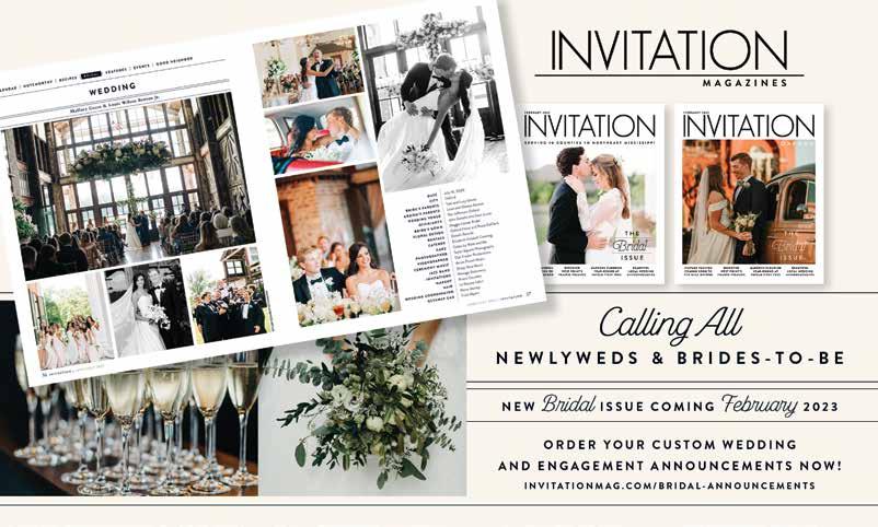 NOVEMBER 2022 | INVITATION 15 PLEASE RECYCLE THIS MAGAZINE EDITORIAL EDITORIAL DIRECTOR Emily Welly EXECUTIVE EDITOR Leslie Criss OPERATIONS DIRECTOR Mary Moreton CONTRIBUTING WRITER Sarah McCullen Eugene Stockstill COPY EDITOR Ashley Arthur SOCIAL MEDIA COORDINATOR Mary Kelley Zeleskey ART CREATIVE DIRECTOR Holly Vollor STAFF PHOTOGRAPHER Joe Worthem CONTRIBUTING PHOTOGRAPHERS Lisa Roberts Hannah Turner Winnie Wilson OFFICE BUSINESS MANAGER Hollie Hilliard DISTRIBUTION Brian Hilliard MAIN OFFICE 662-234-4008 To subscribe to one year (10 issues) or to buy an announcement, visit invitationmag.com. To request a photographer at your event, email Mary at mary.invitation@gmail.com. Invitation Magazines respects the many diverse individuals and organizations that make up north Mississippi and strives to be inclusive and representative of all members of our community. PUBLISHER Rachel West ADVERTISING ADVERTISING CONSULTANTS Alise M. Emerson Amber Lancaster Leigh Lowery Lynn McElreath Moni Simpson Whitney Worsham ADVERTISING DESIGNERS Paul Gandy Markka Prichard ADVERTISING INFORMATION ads@invitationoxford.com