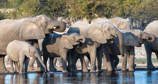A herd of elephants stops for water at a water hole in Etosha National Park, Namibia.