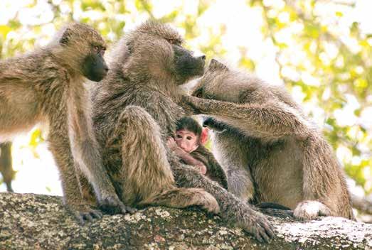 A baboon family rests in a tree at the gate to the Serengeti National Park, Tanzania.