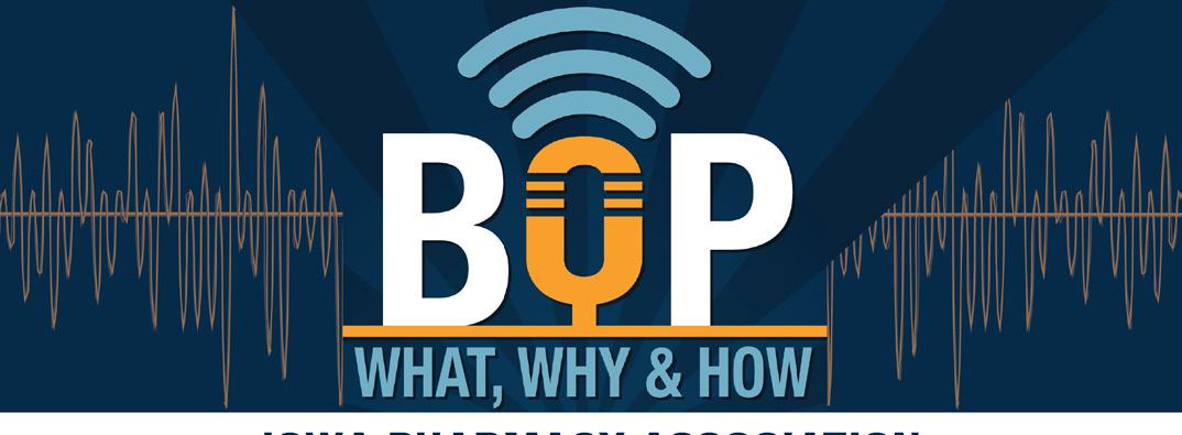 “The Journal of the Iowa Pharmacy Association” (ISSN 1525-7894) publishes 4 issues per year: January/February/March issue; April/ May/June issue; July/August/September issue; and October/November/December issue by the Iowa Pharmacy Association, 8515 Douglas Avenue, Suite 16, Des Moines, Iowa 50322. Periodicals postage paid at Des Moines, Iowa and additional mailing offices. POSTMASTER: Send address changes to: The Journal of the Iowa Pharmacy Association, 8515 Douglas Ave., Suite 16, Des Moines, IA 50322. Published quarterly, The Journal is distributed to members as a regular membership service paid for through allocation of membership dues. Subscription rates are $100 per year, single copies are $30. Printed by Mittera; Graphic design done by the Iowa Pharmacy Association.