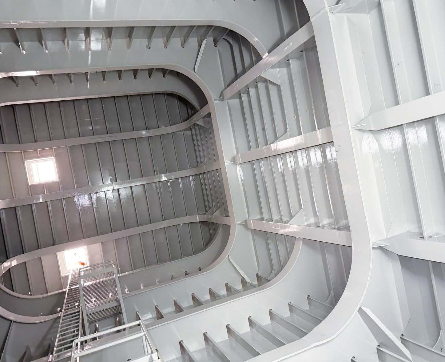 Besides the external coating Jotun also secured the interior, which can be compared to a ballast tank and represents even larger surface areas. Jotun’s solvent-free solutions, in line with the owner’s sustainability requirements, was used and applicated in partnership with steel fabricator Matière and Italian applicator Petrol Lavori.