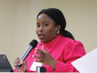 Left: Akalegbere, her sister Nneka, and Judy Walser at a county election pre-primary action at a local synagogue (Courtesy of Ogechi Akalegbere). Right: Akalegbere as a panelist at “Prophetic Communities.”