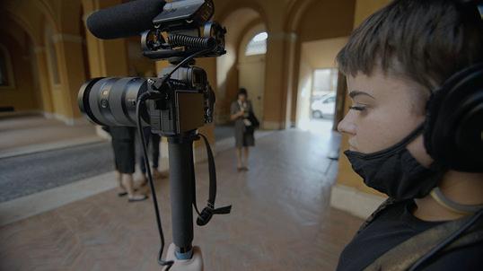 Above: A behind-the-scenes photo of Christine Delp filming a documentary in Rome during the Synod on Synodality. Page 6: Casey Stanton of Discerning Deacons appears in a still from Christine Delp's upcoming documentary.