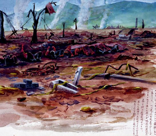 Meinem Vater gelang es, zu meiner Schule zu kommen und mich zu finden. Auf dem Heimweg, mein Vater trug mich auf dem Rücken, wurde ich Zeugin der Hölle auf Erden. Ich sah einen Mann mit verbrannter und abgezogener Haut, die von seinem Körper herabhing. Eine Mutter trug ein Baby, das schwarz verbrannt war und wie Holzkohle aussah. Sie selbst hatte schwere Verbrennungen am ganzen Körper und versuchte, zu fliehen, wobei sie fast auf dem Boden kroch. Andere verloren ihr Augenlicht, ihre Augäpfel traten heraus, oder sie rannten umher und versuchten zu fliehen, während sie ihre heraushängenden Eingeweide in den Händen hielten. Immer mehr Menschen versuchten, sich an uns zu klammern und riefen: „Gebt mir Wasser, Wasser, Wasser...“. Da wir nicht in der Lage waren, ihnen zu helfen, ließen wir sie einfach zurück und eilten nach Hause.