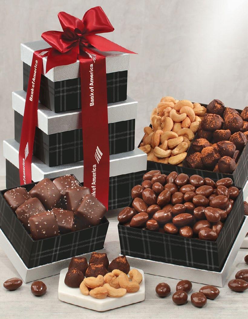 • Features: Chocolate Sea Salt Caramels, Milk Chocolate Almonds, Cocoa Dusted Truffles, Fancy Cashews