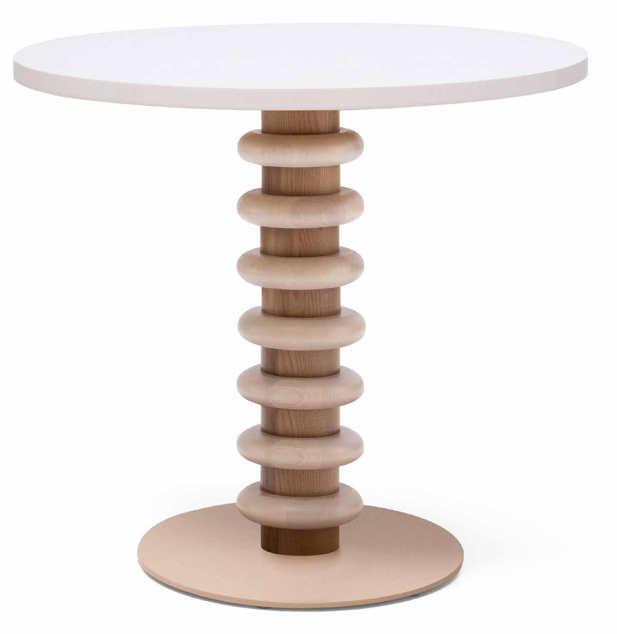 Kemp aims to embody organic design. Its base features wooden rings, while the circles aim to represent repetition. The table “breaks the cycle” and acts as a black sheep who is tired of monotony. The top is made of solid beech/oak wood, laminated particle board or veneered in eco-wood or porcelain, while the column is made of solid turned beech wood.