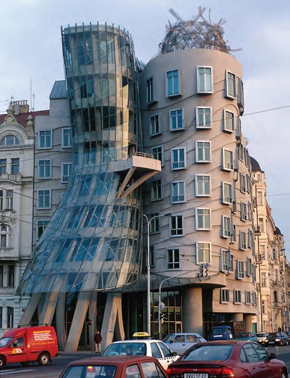 ABOVE LEFT In 1996, Gehry completed an exuberant office building for Dutch insurance company Nationale-Nederlanden. Early in the design process, he nicknamed the project “Ginger and Fred,” connoting the dancers Ginger Rogers and Fred Astaire, whose flow he captured in paired towers.