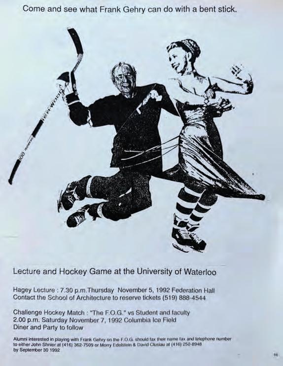 ABOVE RIGHT In a poster for Gehry’s 1992 University of Waterloo visit, alumnus David Clusiau collaged a photo of Frank in hockey gear (from a Knoll advertisement for Gehry-designed bentwood furniture) with a doctored image of Ginger Rogers, alluding to the evolving “Ginger and Fred” project in Prague.