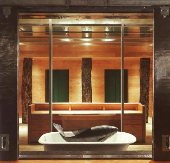 combined plywood, tree trunks, crumpled steel, wool felt, and a focal, disconcertingly real-looking fish in a bathtub. It was a warm, witty, elegant place. An image of it was featured on the cover of the May 1989 issue of Canadian Architect, which included my review of the project.
