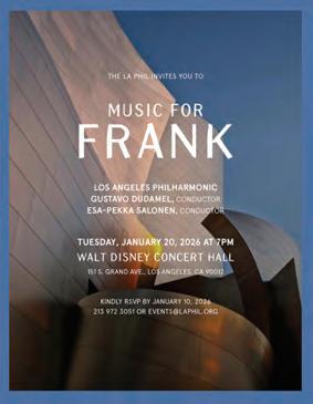 ABOVE LEFT The stainless-steel-clad hall includes extensive public terraces that wind up and around the building. ABOVE RIGHT Invitation to “Music for Frank” at Disney Hall, January 20, 2026.