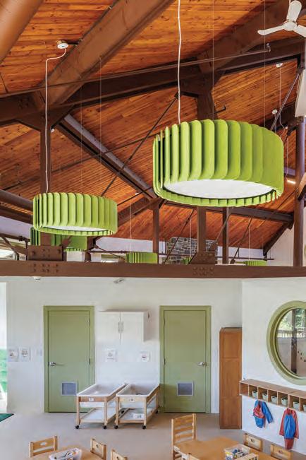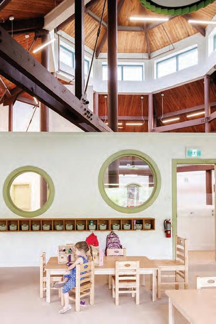 Opposite page The Fluvarium Lilypad Daycare Centre transforms the building’s top floor into a light-filled interior shaped as much by structure as by landscape. Stripped back to reveal its heavy timber frame and distinctive octagonal plan, the space allows architecture to guide atmosphere. Dan Molina