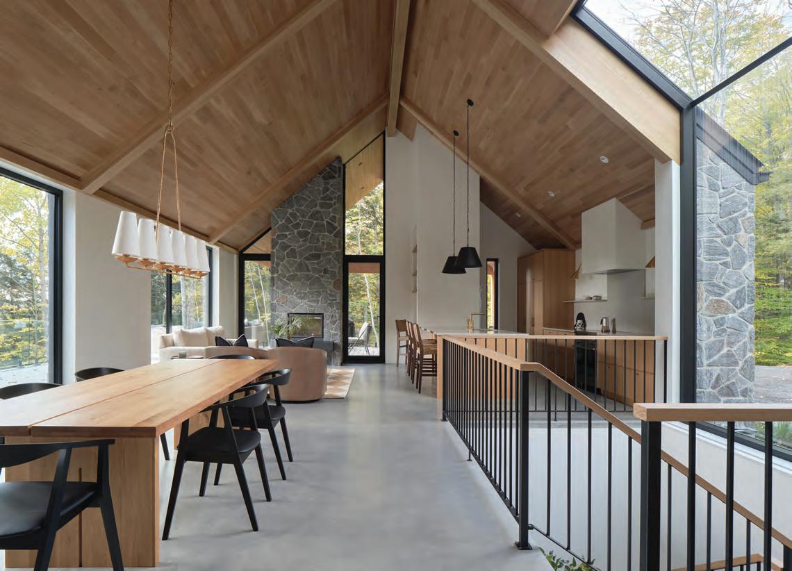 This spread This residence near Bromont offers a disciplined, light-driven interior that balances modernist clarity with material warmth. Beneath a cathedral roof, living, dining, and kitchen zones flow as a single, linear volume, animated by vertical glazing that draws forest light deep into the plan. Stone and black steel set a robust architectural frame, softened inside by restrained wood accents and built-in furnishings. An indoor-outdoor stone fireplace anchors the space, while exposed concrete floors provide both thermal mass and tactile presence.
