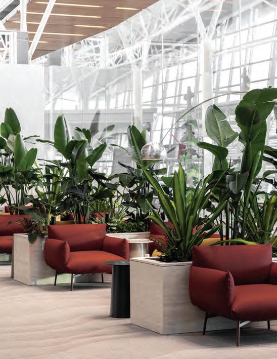 natural barriers, while the raised planter boxes concealed electrical cables and plugs, providing a savvy and simple cover to provide plugs and ports demanded by today’s traveller. “We were very lucky to have a flexible client who was open to how we envisioned the future of Aspire’s physical spaces,” says Dworkind. “We were not constrained by the past and open to explore new materials, colours and textures.”