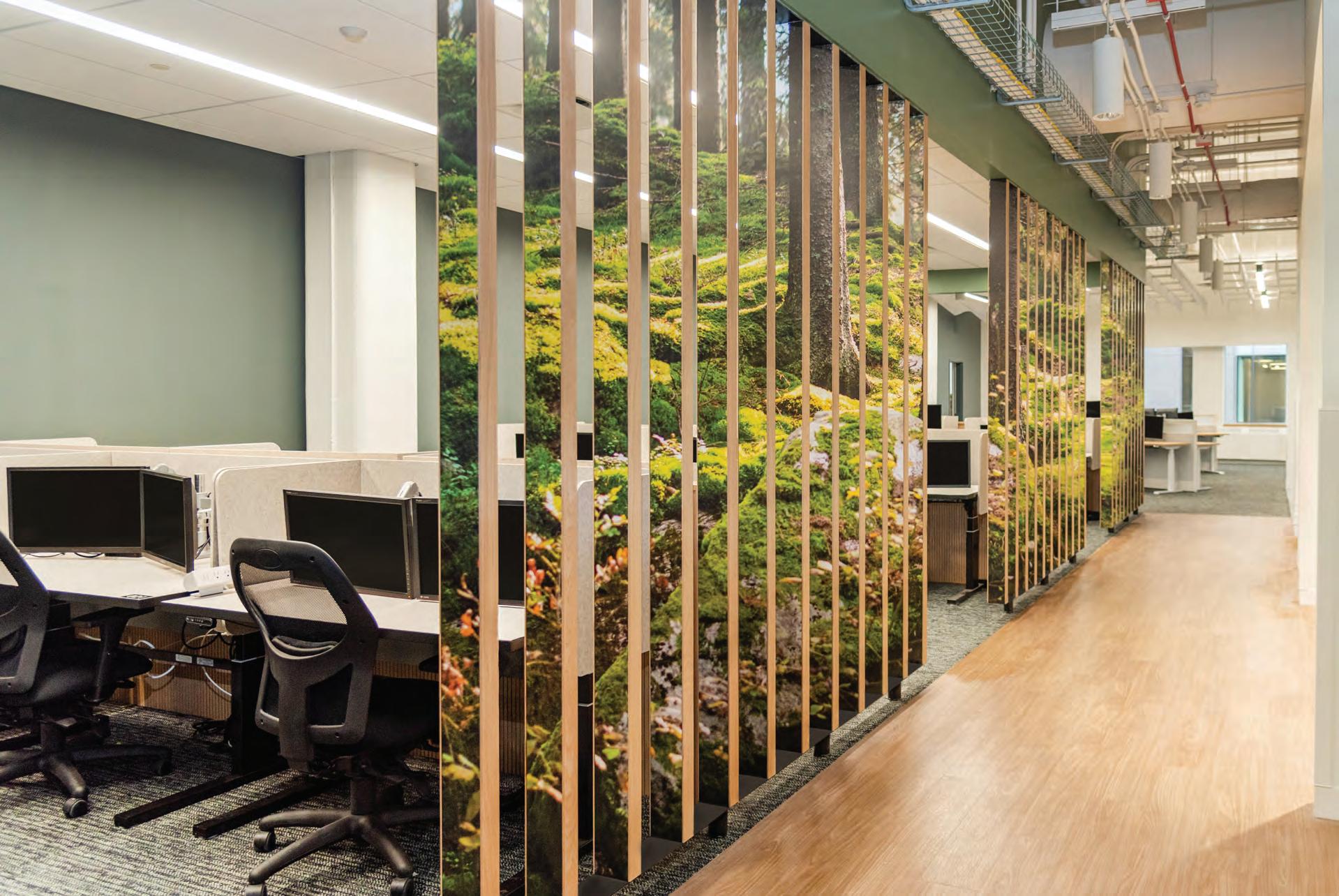 The firm’s first challenge was to solve the issue of additional electrical needs without the ability to drill in concrete floors. The solution? MRDK chose a natural option — plants — which took centre stage. The greenery helped to delineate pathways and create calming