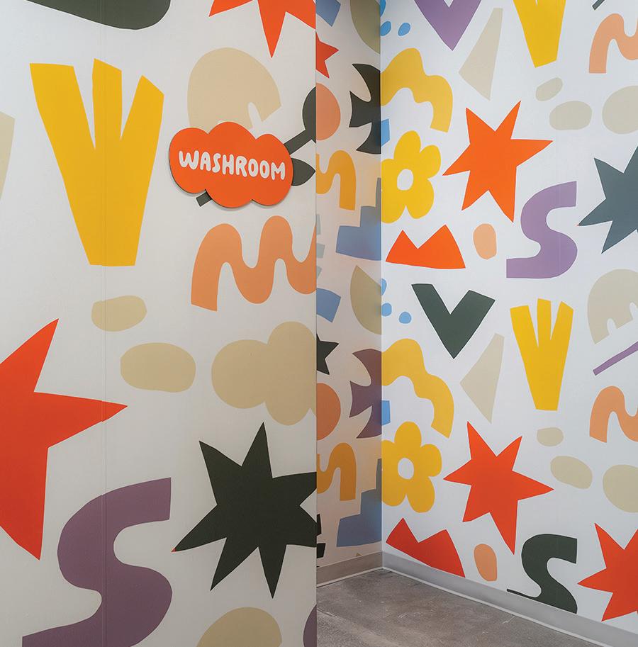 While polished concrete floors occupy the entry areas, the design studio opted for comfortable, double-layer rubber composite flooring in the play areas. Rubber continues into the party rooms in the form of high-performance tile, while the walls favour ceramic tile and melamine cladding. A mural painted by local artist Justin Broadbent adds colour and interest, as do wallpaper, graphics, branding, and a unique abacus-inspired display.