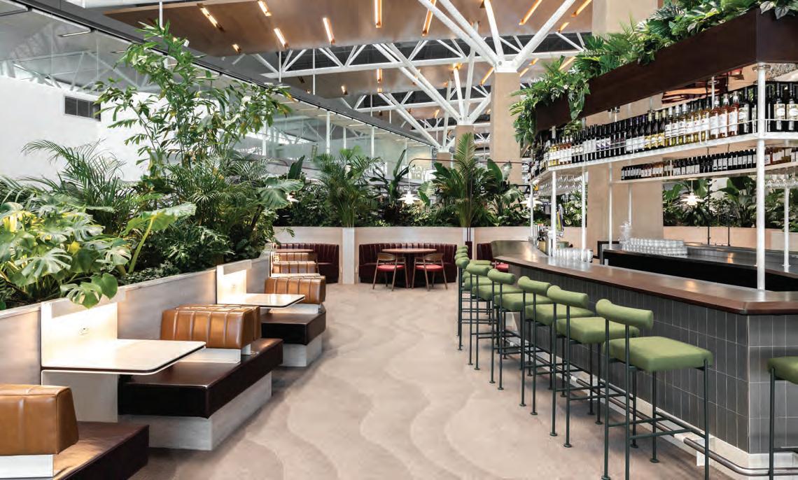 This transborder space is not merely a weigh station for passengers before going to the gate: this airport club offers a variety of seating, additional workspaces for individuals and groups featuring charging ports, small plate menu items reflecting time of day and a lounge bordered by lush tropical plants.
