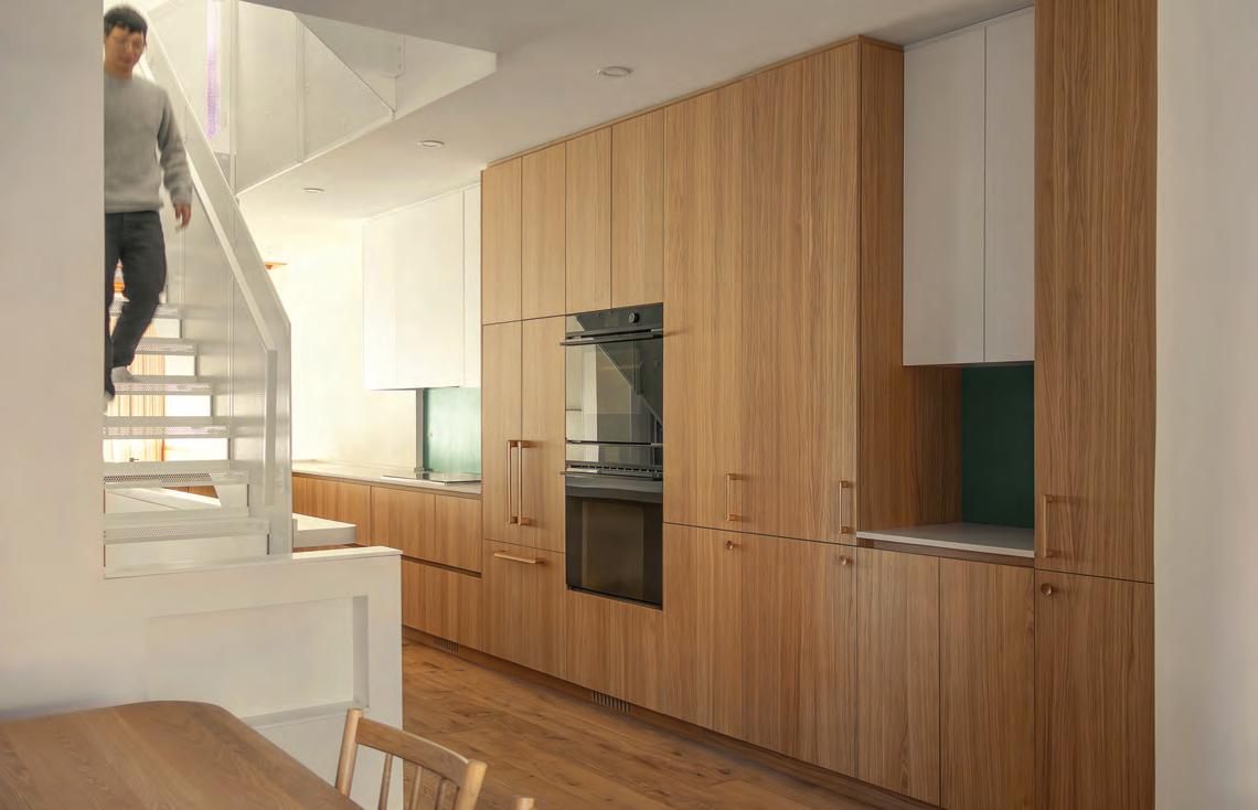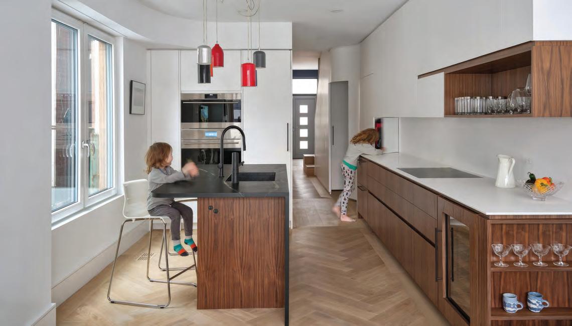 Woodford also notes that the change in building code allowed the design team to avoid the need for a new dividing wall between the public and private spaces, which would have destroyed both the project’s budget and the flow of the existing staircase, as well as intro-