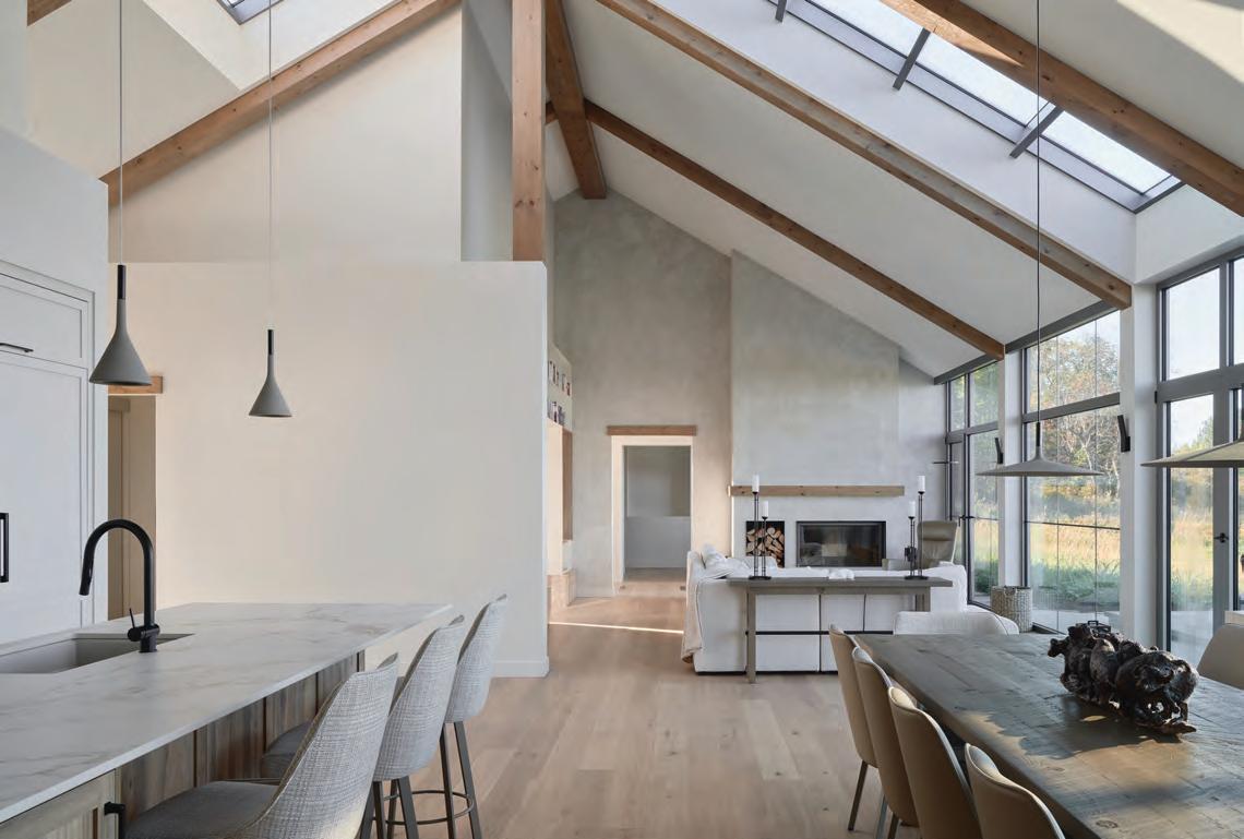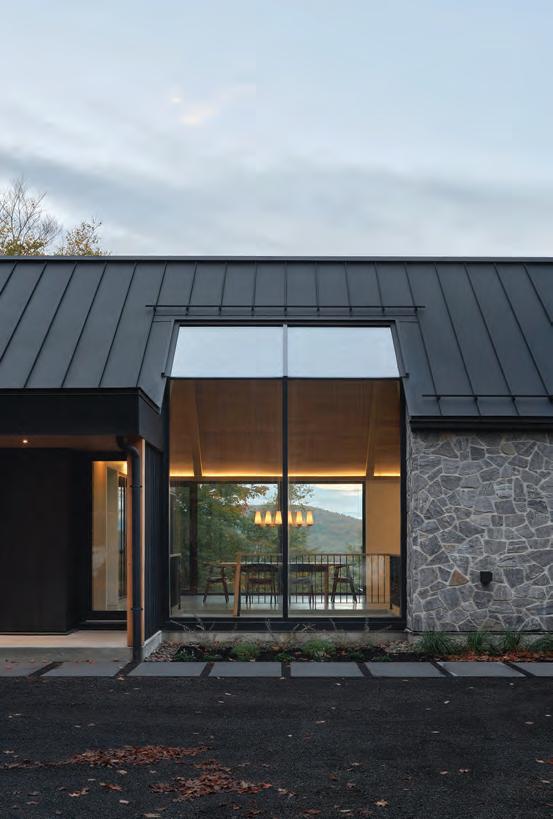 This spread This 5,110-sq.-ft. private residence at the edge of a vast agricultural field near Bolton-Ouest presents a quietly assured interior shaped by light and landscape. Linked by glazed passages, the home’s living spaces unfold across gabled volumes, where weathered cedar, stone, and matte steel establish a refined rural palette. A linear skylight draws daylight into the plan’s core, animating circulation and softening the transition between rooms. Generous glazing frames long views over the fields, ensuring the interior reads as both grounded and expansive.