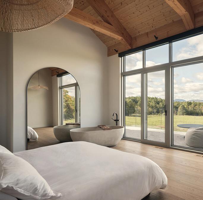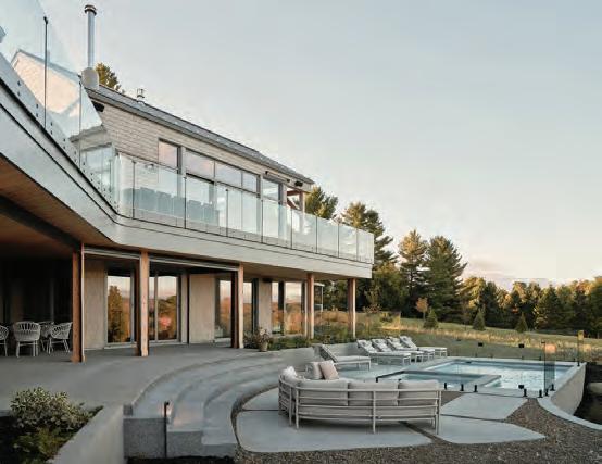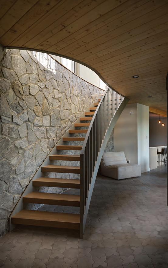 This spread The 4,000-sq.-ft. residence in Georgeville, in the Magog region of Québec, frames interior design as an extension of landscape. Timber structure and red cedar ceilings lend warmth, while natural stone walls pull the site indoors. A central fireplace grounds the living space; the kitchen’s built-in banquette and textile wall treatment add domestic softness. Curved circulation culminates in a stair wrapped by stone, leading to guest rooms below and a bar with retractable glazing that opens directly to the pool, blurring interior, pavilion and terrain.