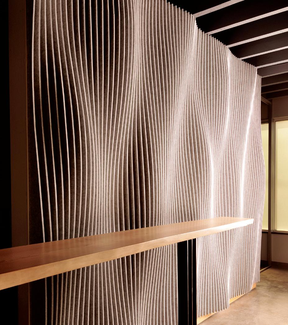 “Warm wood tones, soft textiles, and an earthy palette serve as a grounding backdrop, allowing the ceiling pattern to lead the narra-