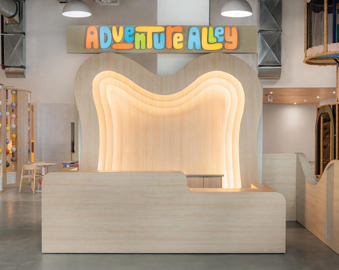 This page In Adventure Alley, party rooms shift mood through light and enclosure. Throughout, durable materials are deployed with restraint, ensuring the interior feels cohesive, contemporary, and quietly sophisticated despite its high-energy brief.