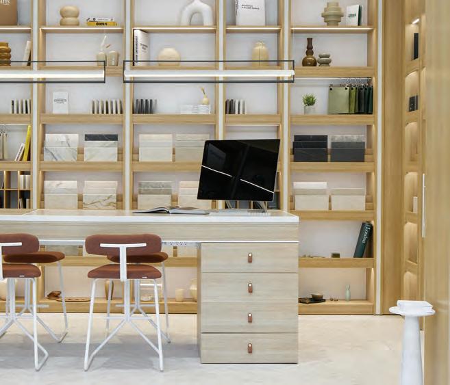 The guiding concept was to create a showroom that goes beyond product display to helping designers envision their projects brought to life with Cosentino materials. Vignettes within the showroom portray relatable, inspirational, real-life applications: a hotel recep-