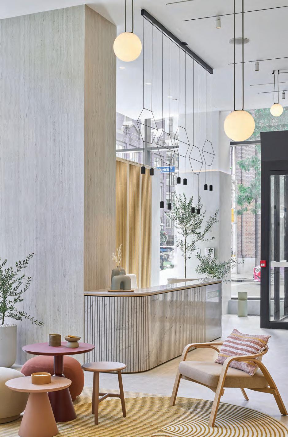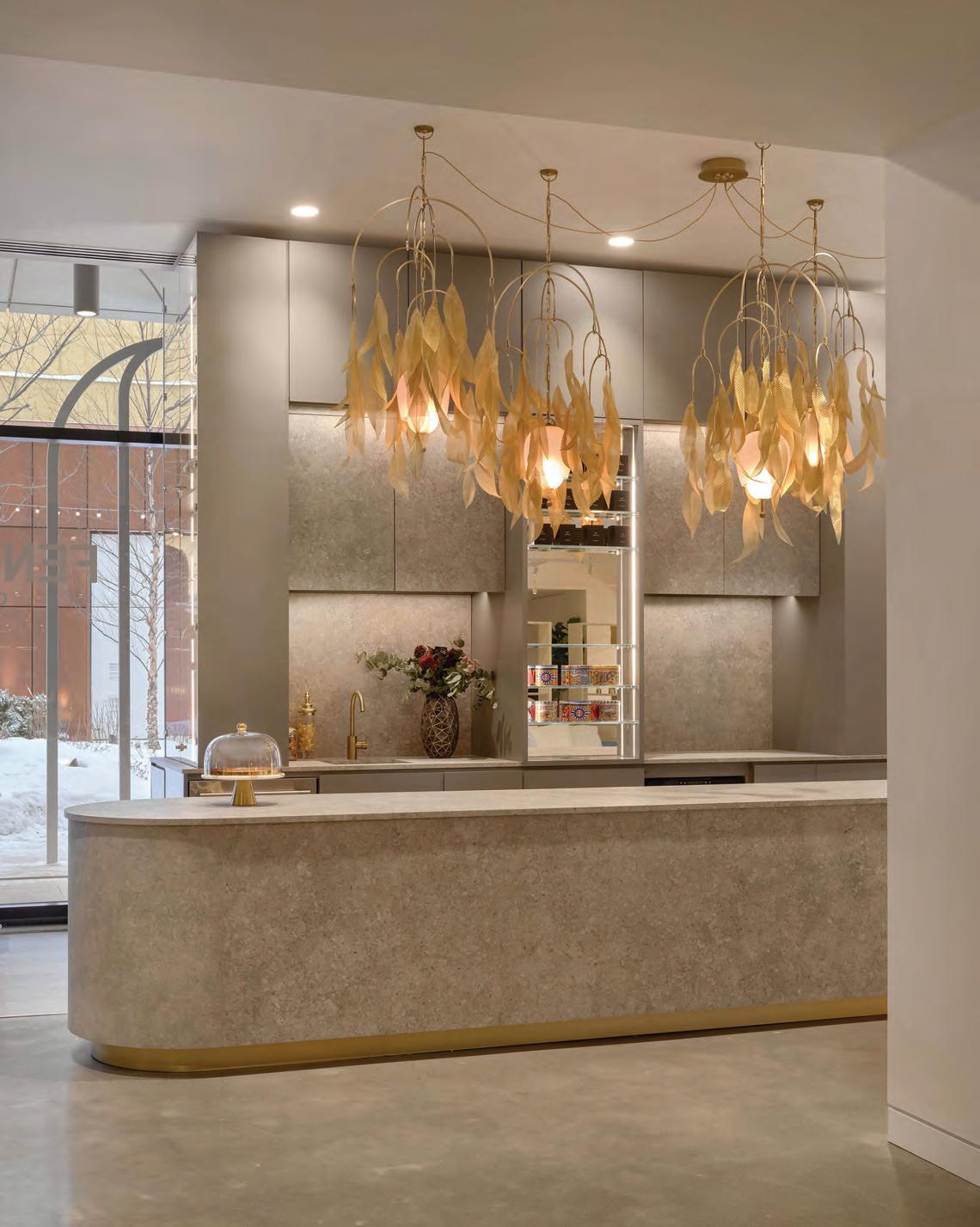 Opposite page Maison Territo’s welcome counter blends noble materials with a sculptural brass pendant light designed by Verchères, Que.-based Larose Guyon, which adds an airy, luminous touch. Above The Fendi Casa living room blends clean lines and architectural details, true to the Roman elegance of the brand.