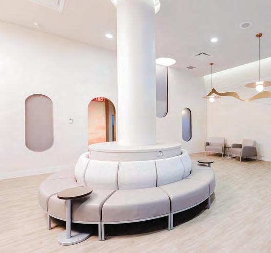 tactile warmth and organic forms that encourage emotional ease. Natural materials anchor spaces in biophilic principles, while lighting and acoustic control fine-tune the body’s response. Reception zones feel more like cafés, hotel lounges or galleries than waiting rooms, using furniture arrangements and multifunctional layouts to foster social connection and a sense of belonging. Intuitive wayfinding eases cognitive load, while durable, cleanable finishes quietly meet regulatory demands without compromising atmosphere. Whether it’s a meditation room at the heart of a dermatology clinic or a staff wellness retreat shaped by user input, these designs choreograph sensory experience to reduce stress, support routine care, and reframe medical visits as acts of self-care. Wellness here operates as infrastructure: spatial, material and social.