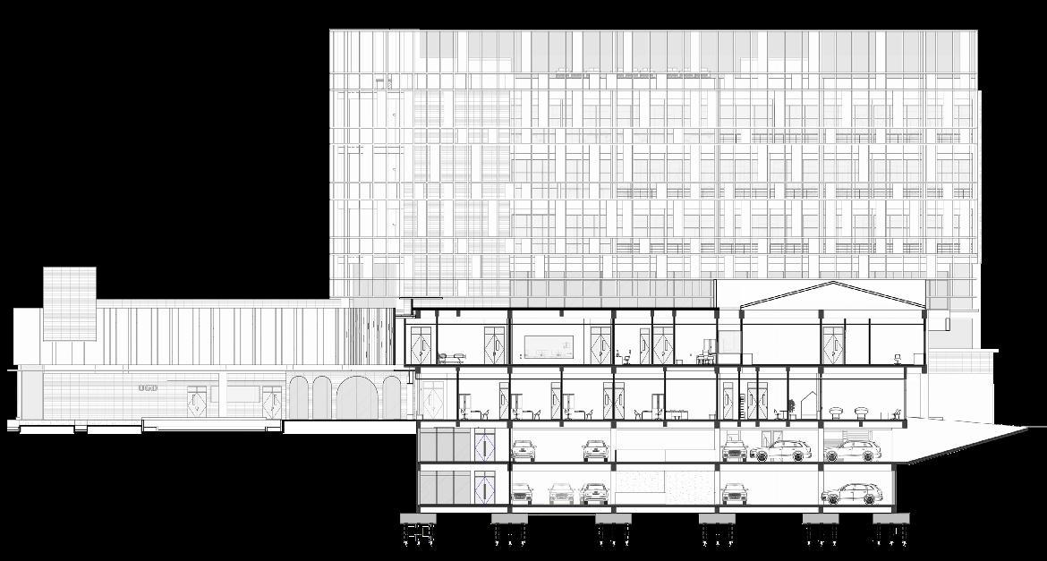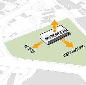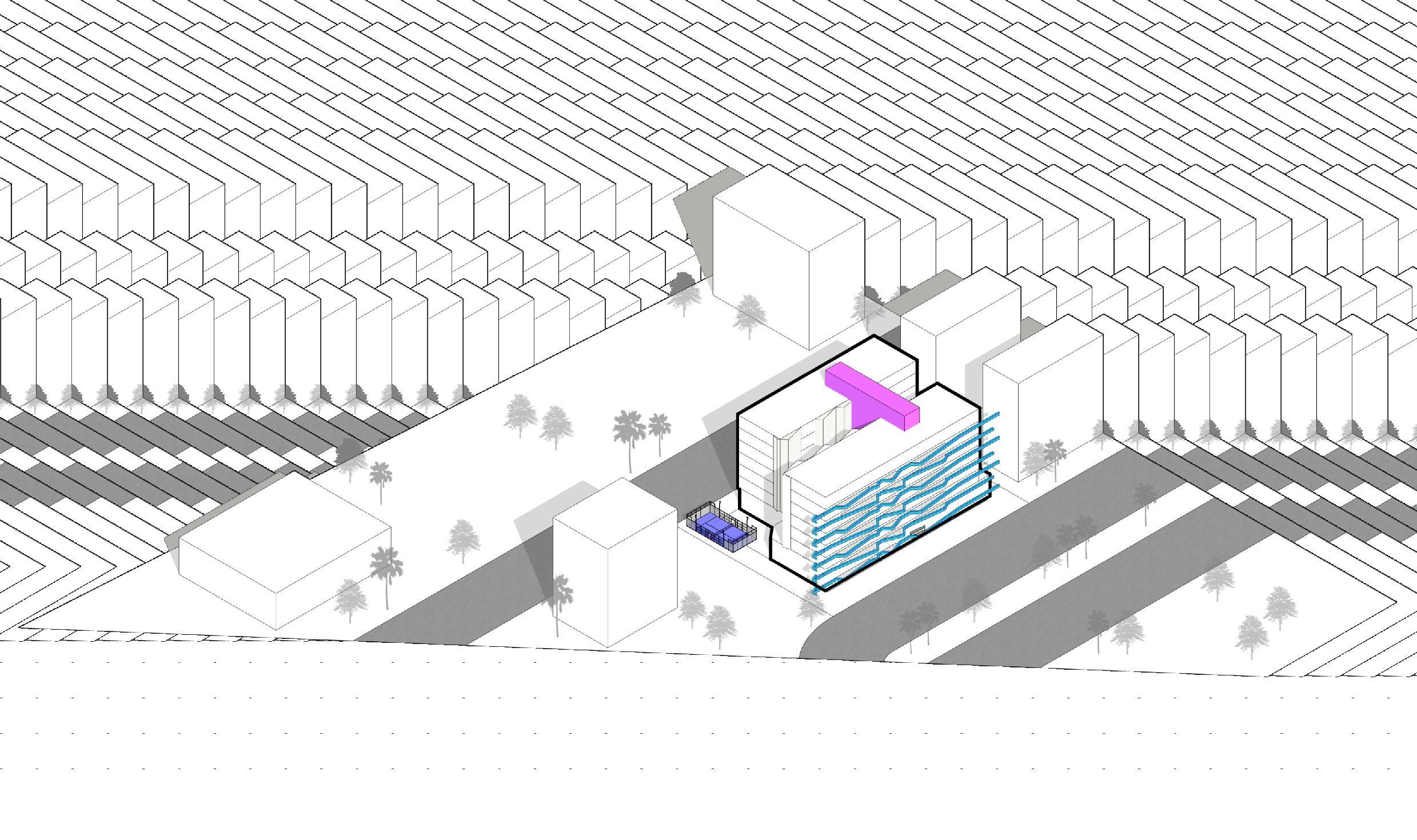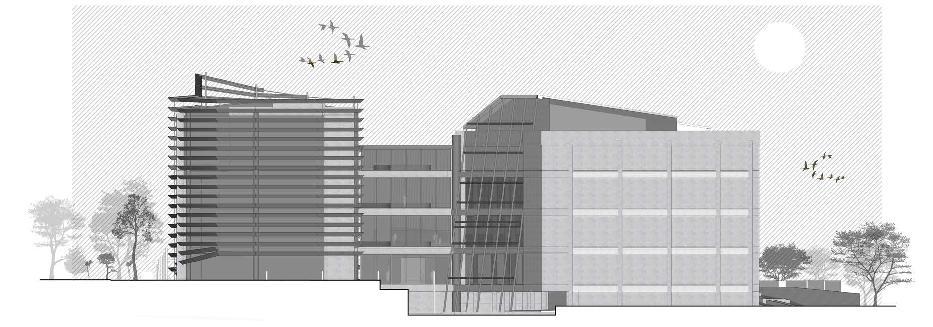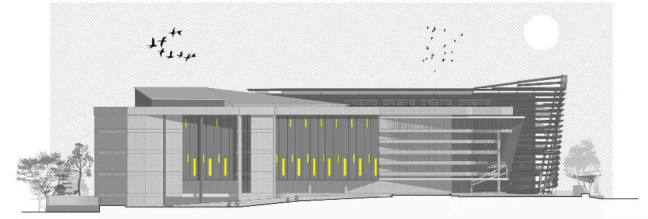 BUILDING MASS FORMATION IS BASED BY A SINGLE BLOCK WITH CONSIDERATION OF THE DISTANCE OF REGULATION BOUNDARY LINES, TOTAL SUM OF AREA PROGRAMMING, AND MAXIMIZING THE POTENTIAL OF THE SITE. PARTS OF THE BUILDING EXPOSED TO THE WEST AREA ARE PROTECTED BY DESIGNED SHADDING COVERING THE WEST PART OF BUILDING THAT ALSO BECOME A UNIQUE FACADE