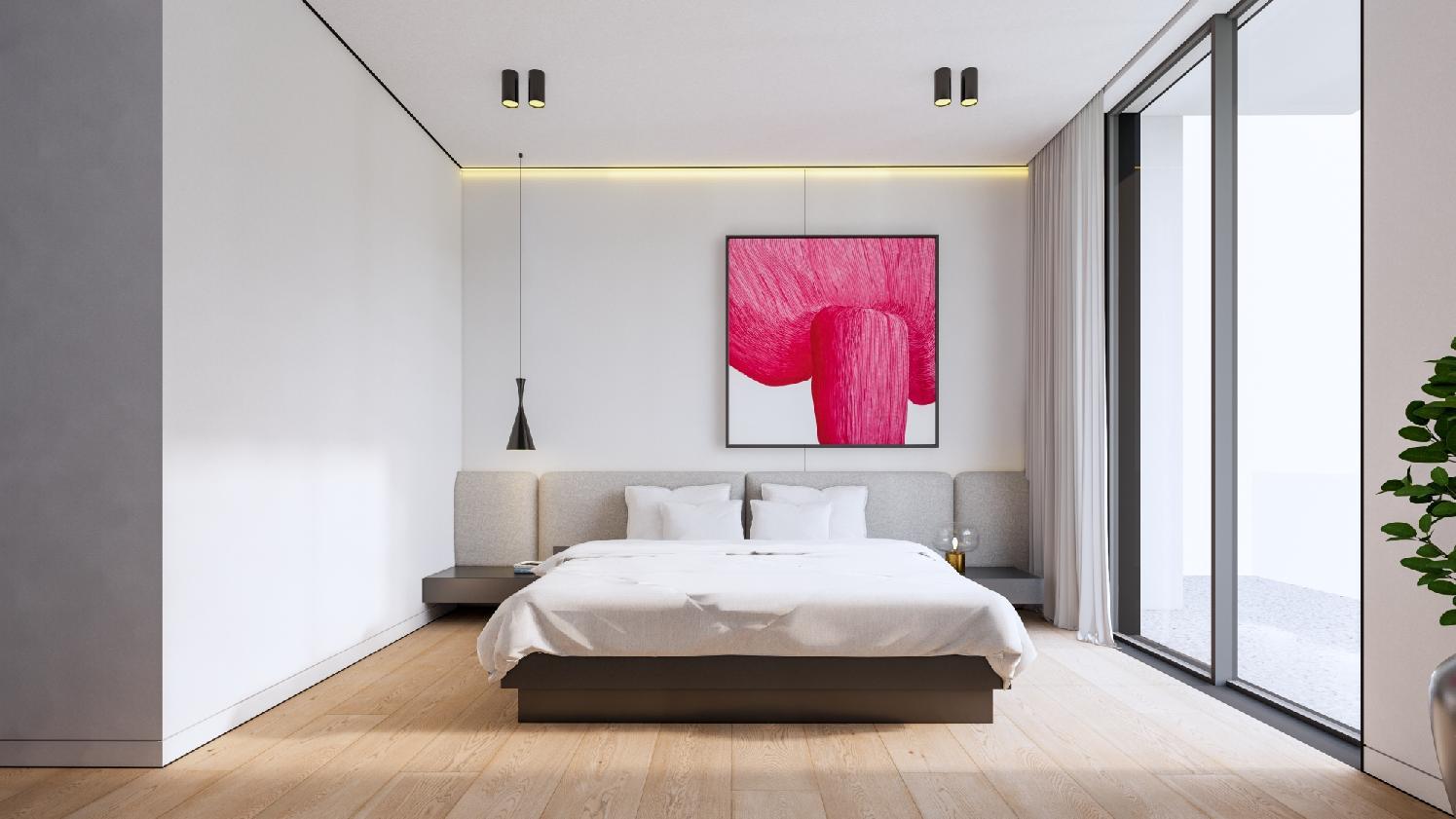 The foundation of the interior design is laid with white oak flooring, offering a warm and inviting base.
