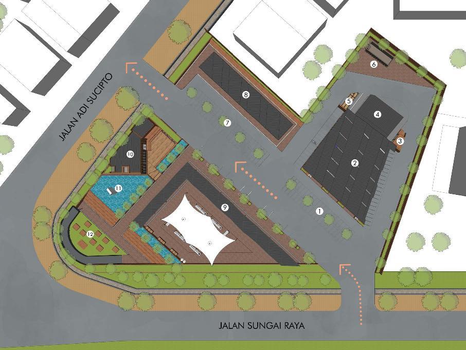 FROM SOME OF THESE CONSIDERATIONS, WE PROVIDE THE APPROPRIATE TITLE FOR FORMER SOEDARSO TERMINAL IN THE FORM OF A POP UP MARKET AND PUBLIC OPEN SPACE, CONSISTING OF A LARGE PLAZA WHICH CAN BE FILLED WITH VARIOUS EVENTS SUCH AS THRIFT MARKETS, FOOD FESTIVALS, ETC. THE CHALLENGE IS HOW TO UNITE THE VARIOUS FUNCTIONS, ALSO TO KEEP THE AREA CLEAN, AND NOT OVERLOADED