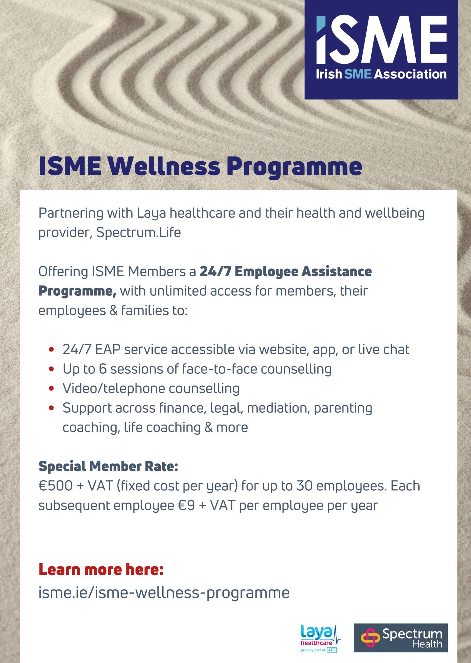ISME partners with Laya healthcare and their health & wellbeing provider, SpectrumLife to provide 24/7 Mental Wellbeing Support Programme (EAP) for ISME Members We offer unlimited access for your employees and their families to a 365 freephone EAP service, accessible via website, app, or live chat. The cost for up to 30 employees is €500 + VAT and each subsequent employee €9 per employee Find out more here