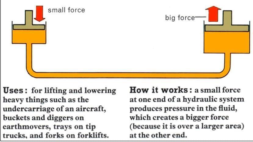 In a hydraulic system, pressure applied at one point is transmitted equallythroughoutthefluid,allowing force to be multiplied or transferred –enabling tasks like liftingafootpathusingsmallinputforce.