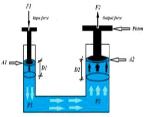 The system uses a fluid-filled cylinder and two pistons of different sizes P1 with a smaller area (A1) and P2 with a larger area (A2). When a small force (F1) is applied to piston P1, it generates pressurethatistransmittedthroughthefluid,causing piston P2 to move upward with a greater force (F2), calculatedasF2=(A2/A1)×F1.