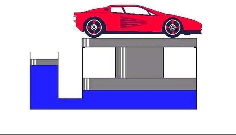 To lift the car, a pump pushes oil into the cylinder, raisingthepistonandthelift.Tolowerthelift,avalve opens allowing the oil to return to the reservoir, and thecardescendsbygravity. The lift remains at a certainlevel when the pump stops and oil is trapped inthecylinder.