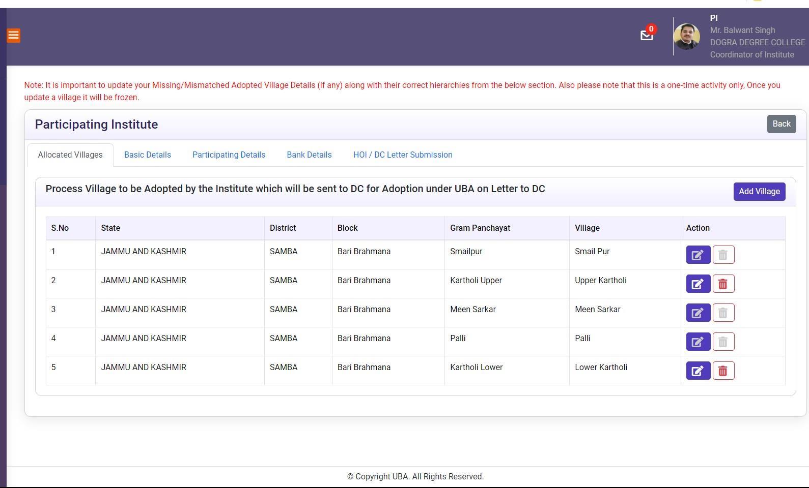 2OptionofaddingvillageintheUBAPortalloginofPIParticipatingInstitute{PI},DograDegreeCollege,Bari Brahmana,SambaJ&KUT