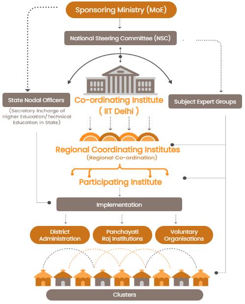 To achieve inclusive societal development, the UBA Participating Institutions are provided with specific requirements to undertake service-learning on the institution's behalf. There is a predetermined hierarchy that all stakeholders must adhere to in order to participate in the program and contribute their unique contributions. In order to clearly make a difference, structured networks with a huge number of institutions working together and a consistent way to organize, carry out, and monitor the actions are necessary. Encouraging synergistic collaboration between relevant ministries, neighborhood Panchayat Raj institutions (PRIs), volunteer organizations, and UBA members is also essential (see Figure 1).Thematchhasjustbeenenvisionedthusfarandisonlybeingstaged