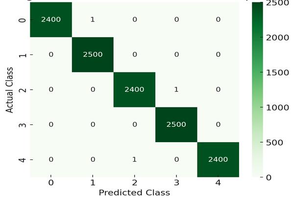 Figure4isa visual representationofthenumerical data in Table 2, showing the strong diagonal structure of the matrix, which means that the system is able to perform almost perfect classification of the five parking zones. More than99.9%ofthetime,thevehicleimagesof each zone are identified correctly. The small off-diagonal values(onlythreemisclassificationsinmorethan12,000 samples) indicate an error rate of about 0.025%. This demonstratesthat the model isnot confused with zones or vehicle types, thus it is robust. The misclassifications (one instance each between Class 1–2, Class 3–4, and Class 5–3) might have been caused by vehicles being on boundary lines or occlusion, rather than a systemic model error. In addition, the use of QR code verification makes the system more reliable. Therefore, if there is a visual misclassification, the unique QR code associated witheachvehiclewillensurethattheentryandexitdata areaccurateandconsistentinthesystemdatabase.