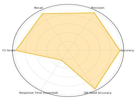 Figure 6 is a complete visual summary of the system's operationalmetrics.Theradarchartdisplaysthatallthe main performance parameters are grouped close to the outer boundary, thus demonstrating almost optimal performance in every direction. One of the main highlightsofvisualrecognitionisthefactthataQRcode canbereadwith99.9%accuracyevenwhenthelighting varies. The reason why all modules from QR scanning tocloudupdates canwork seamlesslywithinreal-time constraints is that the system has very minimal latency. Hence,theresultsstatethatthesystemcanbedescribed ashighlyaccurate,stable,andsuitable for application in extensiveenvironmentsofacity.