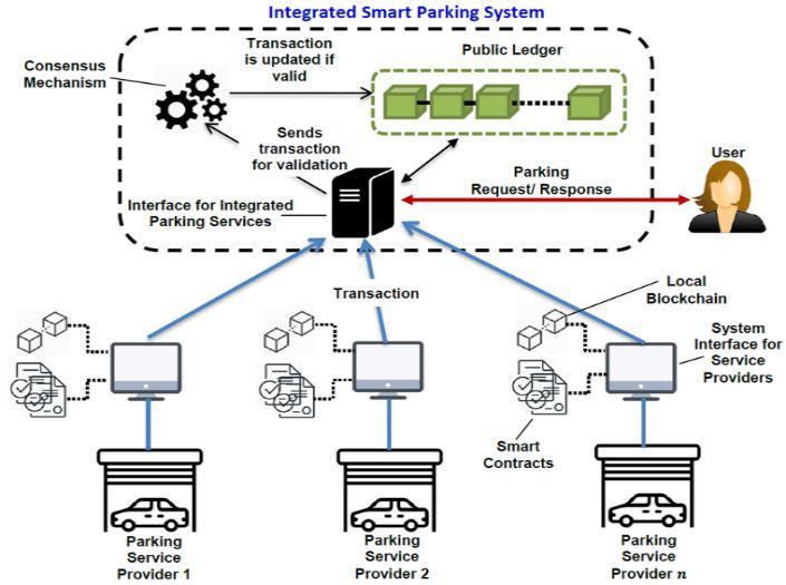 system replies by sending a message to the integrated parkingserviceinterface.Theinterface,therefore,islike a bridgethatconnectsseveral parkingservice providers together, each of whom is running its own local blockchainnetwork.Theselocalblockchainsaretheones that keep records of parking slot availability, transactions, and payments by smart contracts. Each time a parking transaction is done such as reserving a slot, making a payment, or recording entry/exit the transactionissenttotheintegratedparkinginterfacefor confirmation.Therefore,aconsensusmechanismisused bythesystemtodecideifthetransactionisrealbeforeit updates the public ledger. The transaction record thus becomespermanentandaccessiblewhentheyarelinked to the public ledger, thereby, enhancing data integrity andpreventingtamperingorduplication.Asaresult,any parkingservice providercanrun theirbusinessasusual and still have the benefit of being connected to the integrated network through the blockchain infrastructure. On the other hand, the use of QR codes makestheauthenticationofthevehicleeasybecausethe userisonlyrequiredtoscanthecodeattheentranceor exit gate. After that, the decoded data are sent in a securedmannertotheblockchainforverification,which is also the reason why security and traceability of parkingeventsareguaranteed. Thecoreelementsofthe system such as IoT sensors, QR code identification, and blockchain-based validation, together make up a robust, scalable, and secure smart parking ecosystem that is technologically advanced and well suited to urban environments of the future. The design of the system is suchthatitnotonlyfacilitatestheinteractionofdifferent parkingoperatorsbutalso,inessence,allthepartiesthat have a stake in it, by providing them with the access to informationandtrustinthesystem.