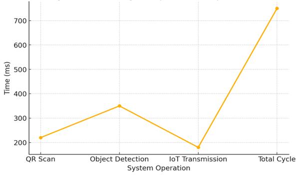 Besides accuracy, the system's response time is equally important to guarantee a trouble-free real-time operation. For the purpose of measuring the efficiency, they timed the performance of each individual subprocess (QR scanning, object detection, IoT transmission,andtotalsystemcycle)overseveralruns.