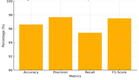 ThecombinedinformationfromtheFigure3andTable1 clearly explains in numbers how effectively the Object Recognition model worked. This is a model which achieved overall accuracy of 96.60%, that is to say, nearly all parking slots were correctly labeled as either occupied or vacant. The system’s effort to reduce false alarms is well reflected in its precision rate of 97.66%. From the operational point of view, it implies that thesystemhardlyever placesa vehiclewhere thereisn't one, thus increasing driver confidence and at the same time, preventing parking slots from being wasted. The recall scoreof95.40%isa testamenttothe factthatthe system is able to find most vehicles and only a few are left undiscovered. As a result, no occupied slot is falsely shownasavailable,thereby,ensuringthatamultitudeof vehicles are not led to the same space. The F1-Score of 97.50%is,therefore,anindicationofagoodequilibrium between precision and recall, which means that the system is capable of operating consistently under reallife scenarios. The fact that the four metrics are all very close, and all at values higher than 95%, shows that the model is stable even when there are changes in the environment.
