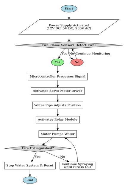 Theflowdiagramillustratesafiredetectionandsuppression system that combines sensors, a microcontroller, and supporting components. The system starts with a power supplythatconverts230VACto12Vand5VDCtooperateall components. Three flame sensors are placed in different zonestodetectfireorflamesandsendcorrespondingsignals to the microcontroller. Acting as the control unit, the microcontrollerprocessestheseinputsandcoordinatesthe system’sresponse Thefiredetectionandsuppressionsystem integrates sensors, a microcontroller, and various componentstoautomaticallyidentifyandextinguishfires.It beginswithapowersupplythatconverts230VACto12Vand 5V DC to operate the system. Three flame sensors are positionedindifferentzonestodetectfireandsendsignalsto