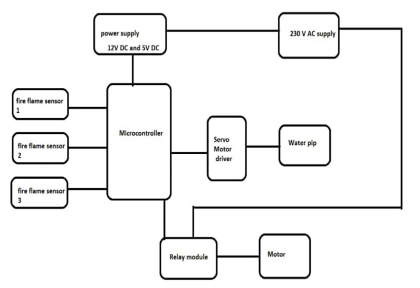 themicrocontroller,whichactsasthecontrolunit.Basedon sensor input, the microcontroller activates a relay module that controls the motor responsible for pumping water. Simultaneously,aservomotordriverdirectsaservomotor connectedtoawaterpipe,aimingitpreciselyatthefire.The water pipe then delivers water to extinguish the flame. Physically, the system is laid out over a rectangular area (such as a room or hall), with vertical lines representing sensorplacementsandthewaterpipeorsprinklersystem positionedabove.Thissetupensuresefficientfiredetection, targetedsuppression,andautomaticoperation.[4}