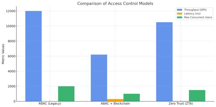 To assess the functioning of the suggested hybrid framework,itwasnecessarytomarkitwithkeyaspectsof operation latency, throughput,and scability. Underall the controlled workloads the experiments were made with Apache JMeter which simulated a variety of database accessrequestslikereading,writingandpolicyevaluation operations.Thethroughputparameter,thatis,queriesper second(QPS),showedhowmanyrequeststheframework wasabletoprocessatthesametime.Althoughtheoriginal RBACmodel showedthe bestthroughput ofabout12,000 QPS since its policy evaluation overhead was minimal, when ABAC and blockchain were combined, the corresponding throughput was 6,200 QPS, which the use of smart contracts and checks on attributes in real-time playedthemainrole.