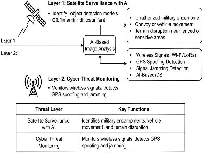 Thispaperproposesadual-layersystemcombiningAI-based satellitevisionwithcommunication-layerthreatdetection offeringreal-timesituationalawarenessofbothphysicaland digitalthreatsacrossborderzones.