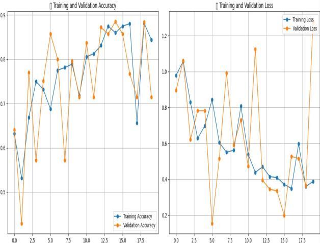 The model was trained for 20 epochs. Validation accuracypeakedat89.75%withaminimumvalidation loss of 0.1653. Training accuracy reached 88.65% by the19thepoch.